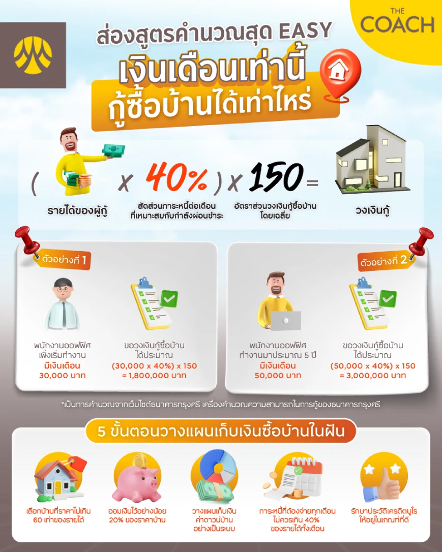 แต่หนึ่งคำถามที่มักจะมีอยู่ในใจก็คือ “ถ้าเป็นพนักงานออฟฟิศที่มีเงินเดือนเท่านี้ จะกู้เงินซื้อบ้านได้เท่าไร?” Krungsri The COACH จะพาทุกคนมาดูสูตรคำนวณเงินกู้บ้านสุด EASY กัน พร้อมวิธีวางแผนผ่อนบ้านเดือนละเท่าไรให้เหมาะสมกับรายได้ อ่านจบแล้วจะช่วยให้ชาวออฟฟิศนมีแนวทางที่ชัดเจนในการกู้เงินซื้อบ้านอย่าง แน่นอน