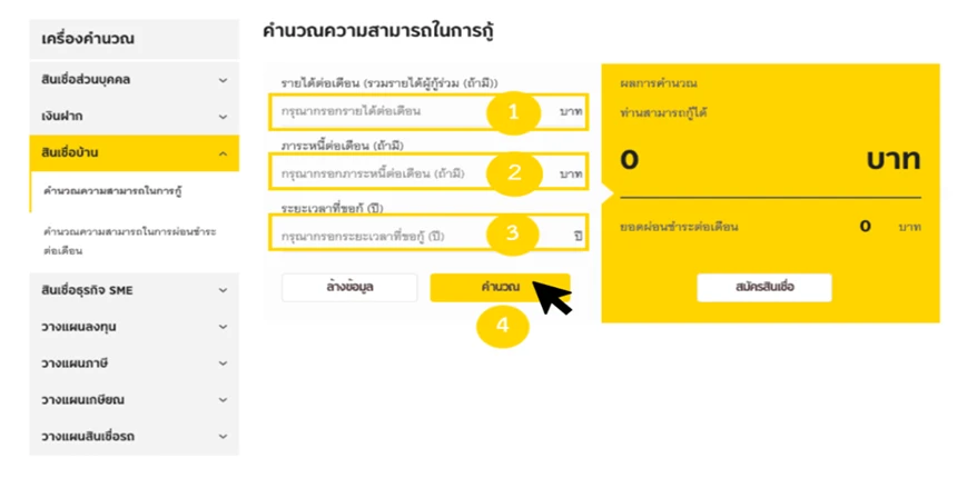 ระบุข้อมูลให้ครบทุกช่องเพื่อคำนวณวงเงินกู้ซื้อบ้านสูงสุด